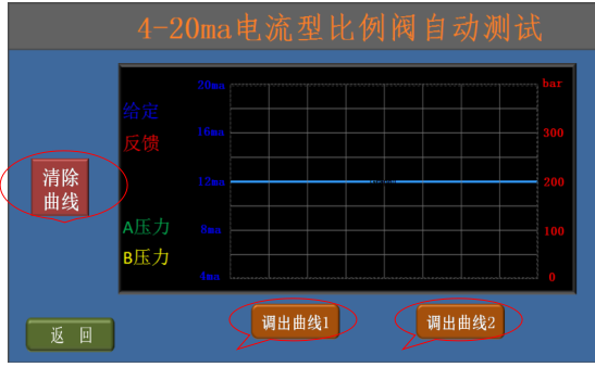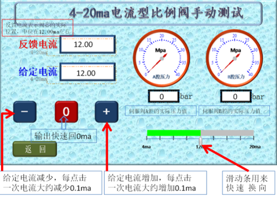 6、比例閥正常時的表現(xiàn)為:a、給定電流12.00ma時,反饋電流在12.00ma,比例閥輸出的A、B腔壓力相同;b、用滑動條可迅速換向,反饋電流改變且A、B腔壓力差較大;c、點擊增加按鈕,反饋電流逐漸增加且A、B腔壓力差逐漸增大;d、點擊減少按鈕,反饋電流逐漸減少且A、B腔壓力差逐漸減少,過12.00ma后比例閥會換向;