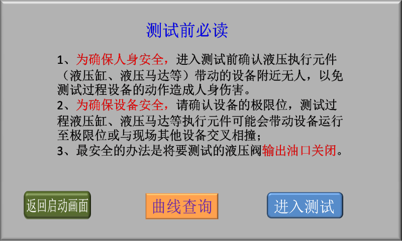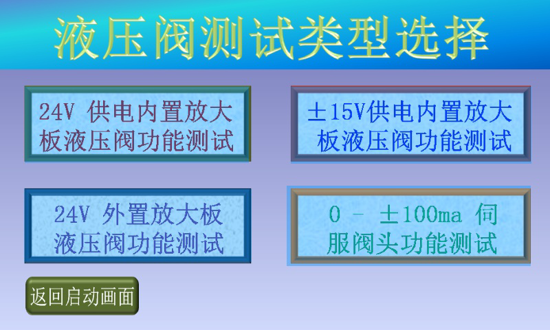 3、確認(rèn)現(xiàn)場(chǎng)人員和設(shè)備安全后,點(diǎn)擊“進(jìn)入測(cè)試”,進(jìn)入液壓閥測(cè)試類型選擇畫面;