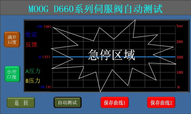 自動(dòng)測(cè)試過程中出現(xiàn)緊急情況,可點(diǎn)擊屏幕中間黑色的曲線部分,儀器將給伺服閥斷電,重新選擇開口度后儀器會(huì)再次給伺服閥上電;