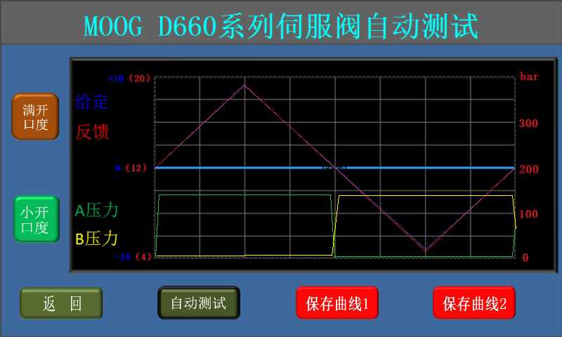 8、選擇滿開口度后點(diǎn)擊“自動(dòng)測(cè)試”可使伺服閥從0開口度逐漸增加到+100%開口度,再逐漸減少到-100%,然后逐漸增加到0開口度;選擇小開口度后點(diǎn)擊“自動(dòng)測(cè)試”可使伺服閥從0開口度逐漸增加到+20%開口度,再逐漸減少到-20%,然后逐漸增加到0開口度;